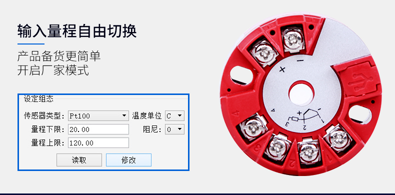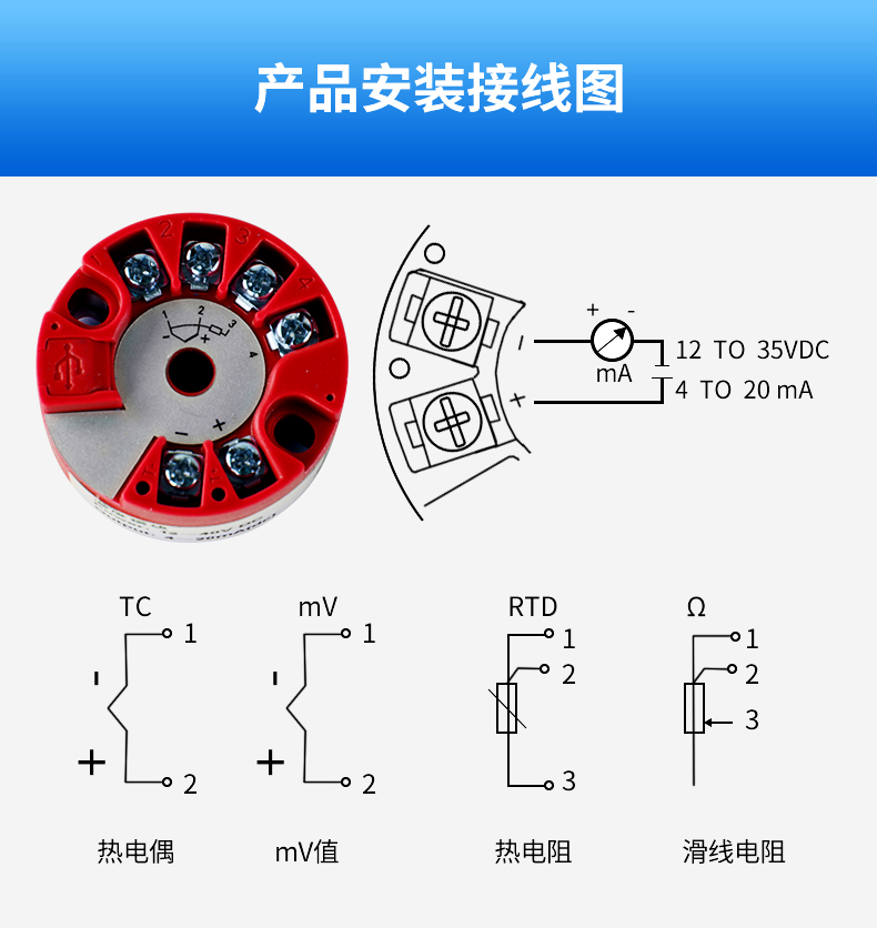 溫度變送器采用熱電偶、熱電阻作為測溫元件,從測溫元件輸出信號送到變送器模塊,經(jīng)過穩(wěn)壓濾波、運算放大、非線性校正、V/I轉(zhuǎn)換、恒流及反向保護(hù)等電路處理后,轉(zhuǎn)換成與溫度成線性關(guān)系的4~20mA電流信號0-5V/0-10V電壓信號,RS485數(shù)字信號輸出。