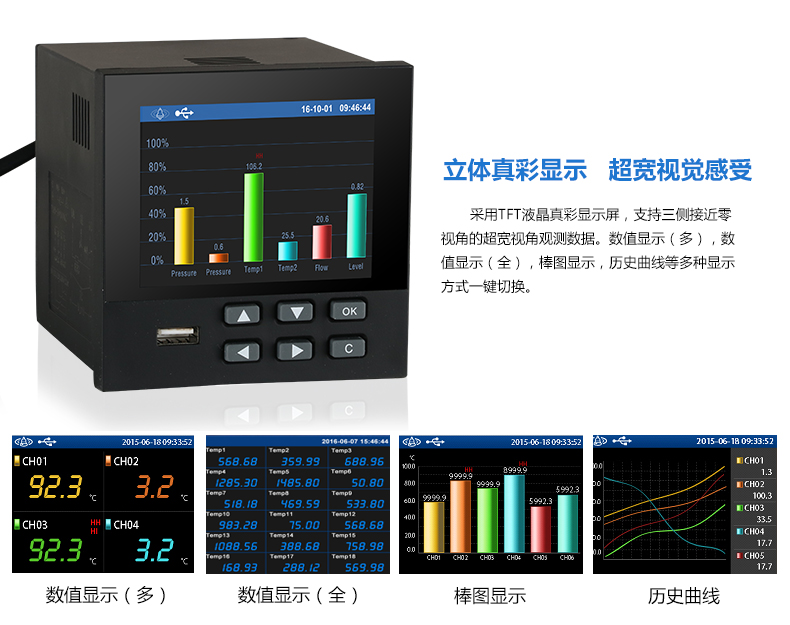 無紙記錄儀是將采集的數(shù)據(jù)/運算數(shù)據(jù)以時間為基軸記錄在儀器內(nèi)部的存儲系統(tǒng)中,無消耗任何常用的記錄設(shè)施,如:紙張、筆墨。記錄在儀器內(nèi)部的存儲數(shù)據(jù),通過運算、模擬后顯示在液晶屏。常用顯示用液晶屏比較廣泛。在液晶屏屏幕上,可以顯示數(shù)字顯示、棒圖顯示、曲線顯示、報警列表等。無紙記錄儀采集的數(shù)據(jù),常用的有:溫度、壓力、流量、液位、電壓、電流、濕度、頻率、振動、轉(zhuǎn)速等。