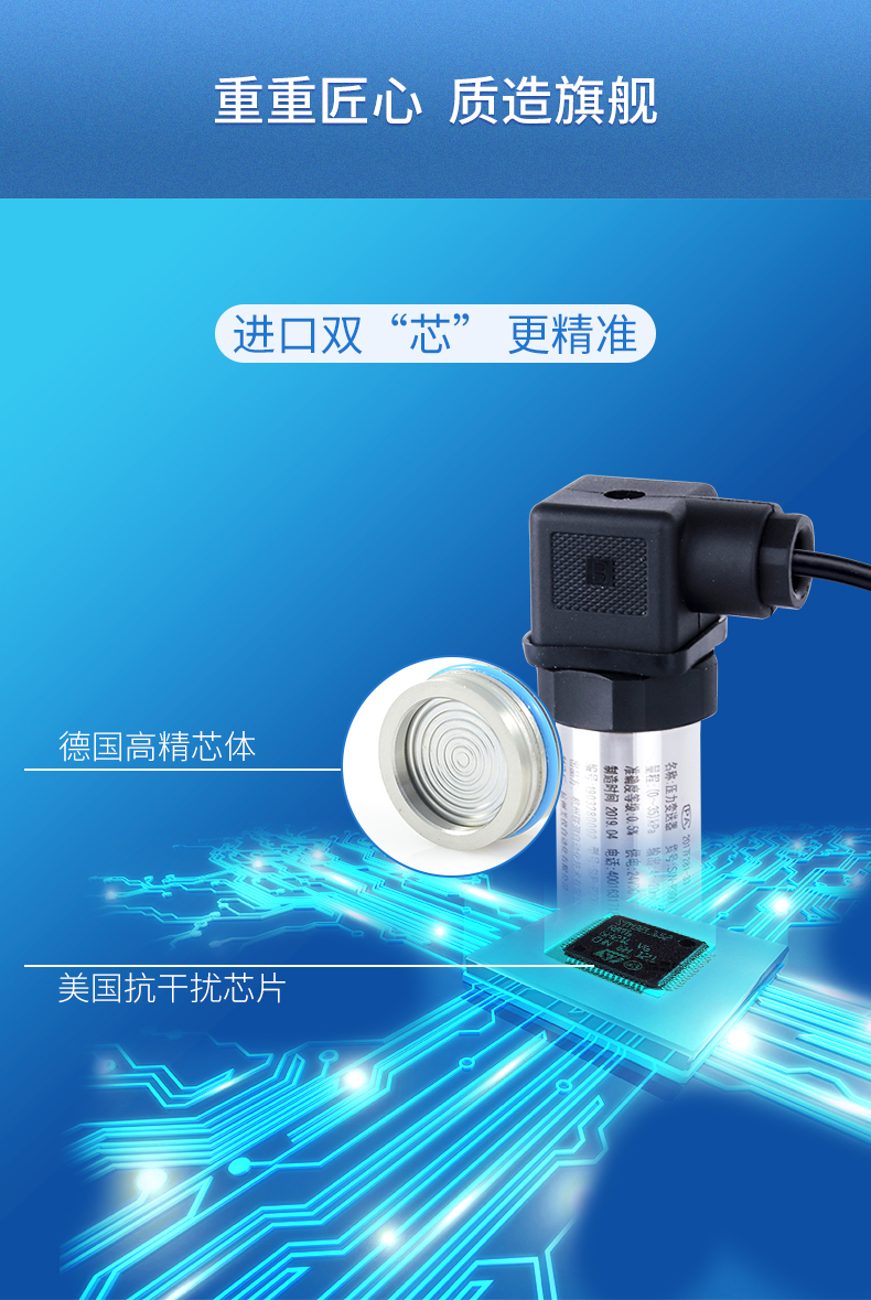 SIN-P300通用型壓力變送器德國進口硅芯片,精度高性能穩定;SIN-P300型通用型壓力變送器采用擴散硅壓力芯體作為敏感元件,內置處理電路將傳感器毫伏信號轉換成標準電壓﹑電流信號輸出,可直接與計算機、控制儀表﹑顯示儀表等相連。選用高穩定性和高可靠性的壓阻式壓力傳感器和高性能的變送器專用電路,整體性能穩定可靠,可進行遠距離信號傳輸。采用一體化全不銹鋼結構,經過多次不銹鋼焊接,實現了全固態設計,安裝方便,具有高抗振性和抗沖擊性,在惡劣環境中可以長期使用。廣泛應用于工業自動化設備配套以及石油、化工、冶金、電力等控制領域。