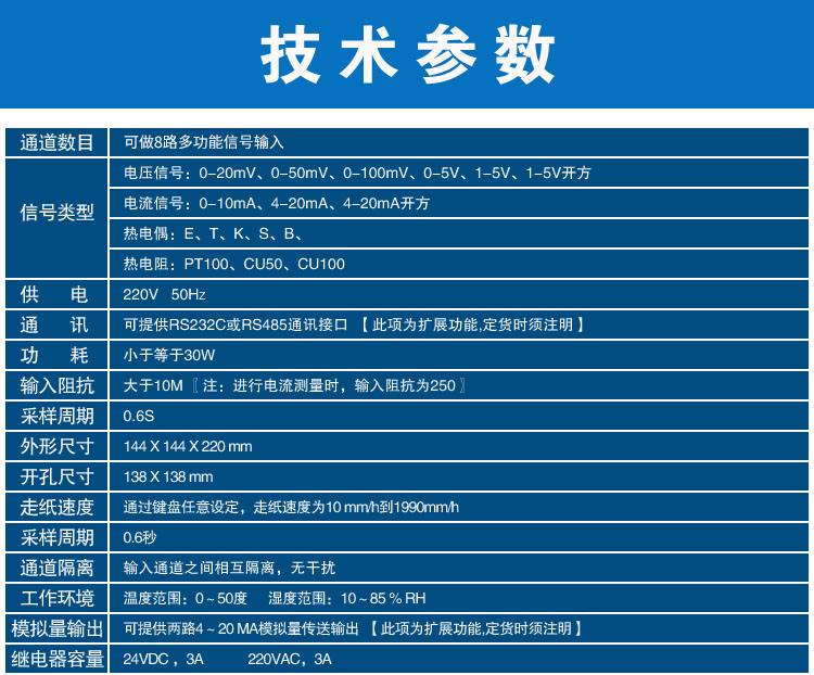 SIN-R1000有紙溫度記錄儀最多具有8路輸入通道,2路模擬量輸出,通道之間采用點點隔離;均可直接選擇接收多種熱電偶、熱電阻、壓力變送器、電壓、電流信號